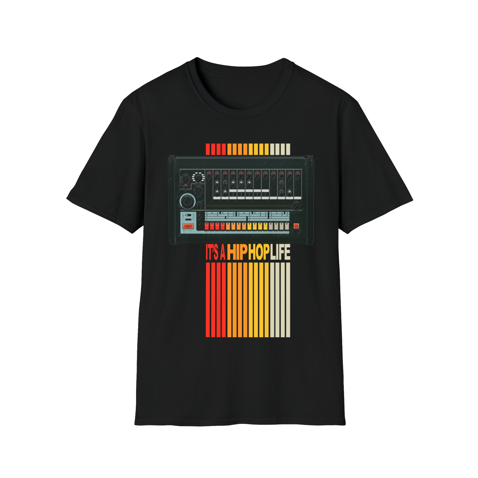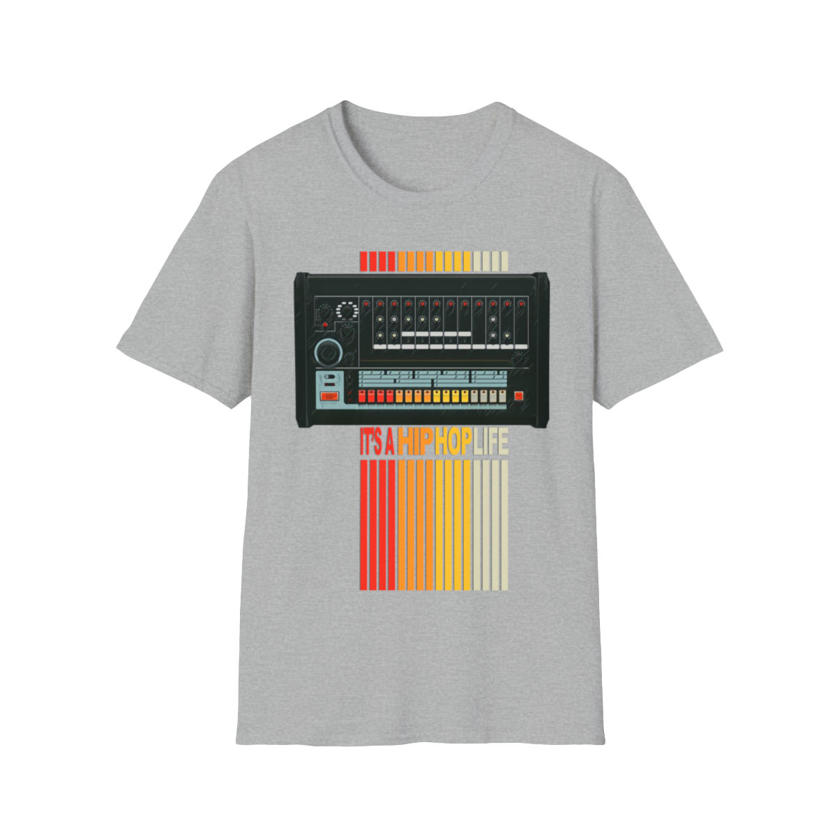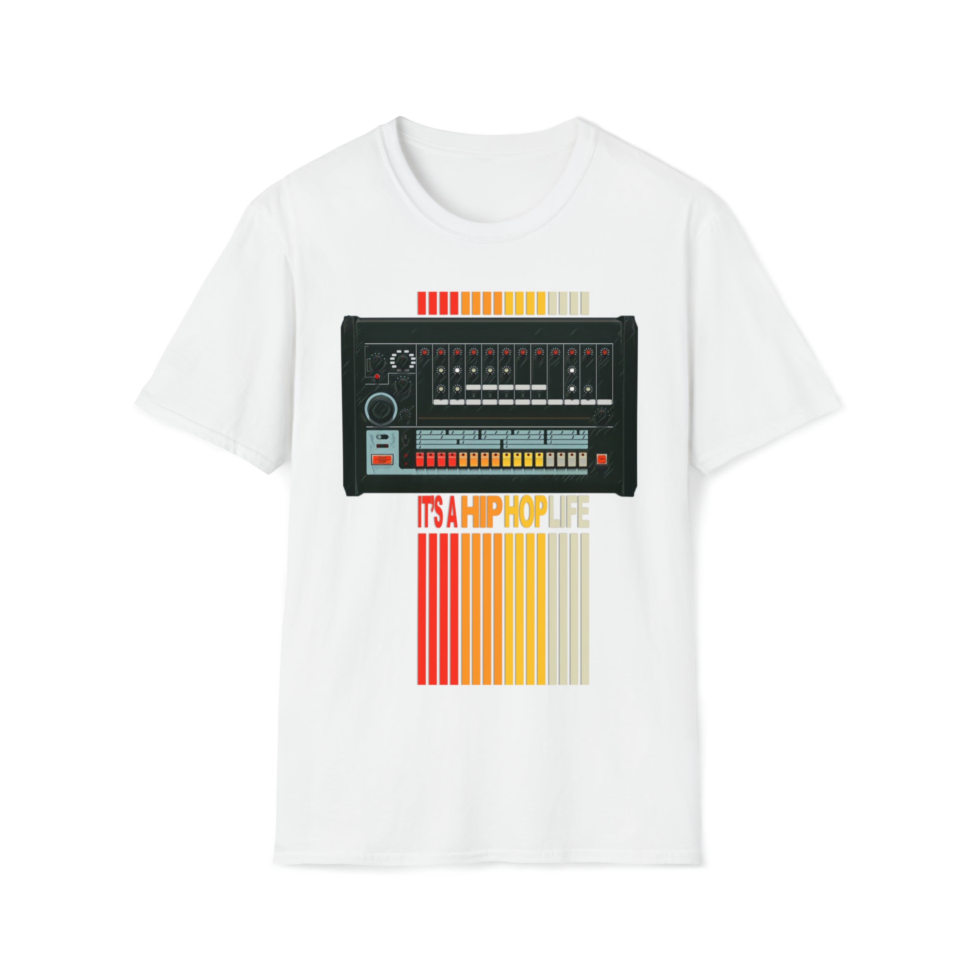 The iconic 808 drum machine birthed beats that ignited hip hop, shaping a genre with its deep bass and rhythmic magic. The unisex soft-style t-shirt puts a new spin on casual comfort. Made from very soft materials, this tee is 100% cotton for solid colors. Heather colors and sports grey include polyester. The shoulders have twill tape for improved durability. There are no side seams. The collar is made with ribbed knitting to prevent curling damage.